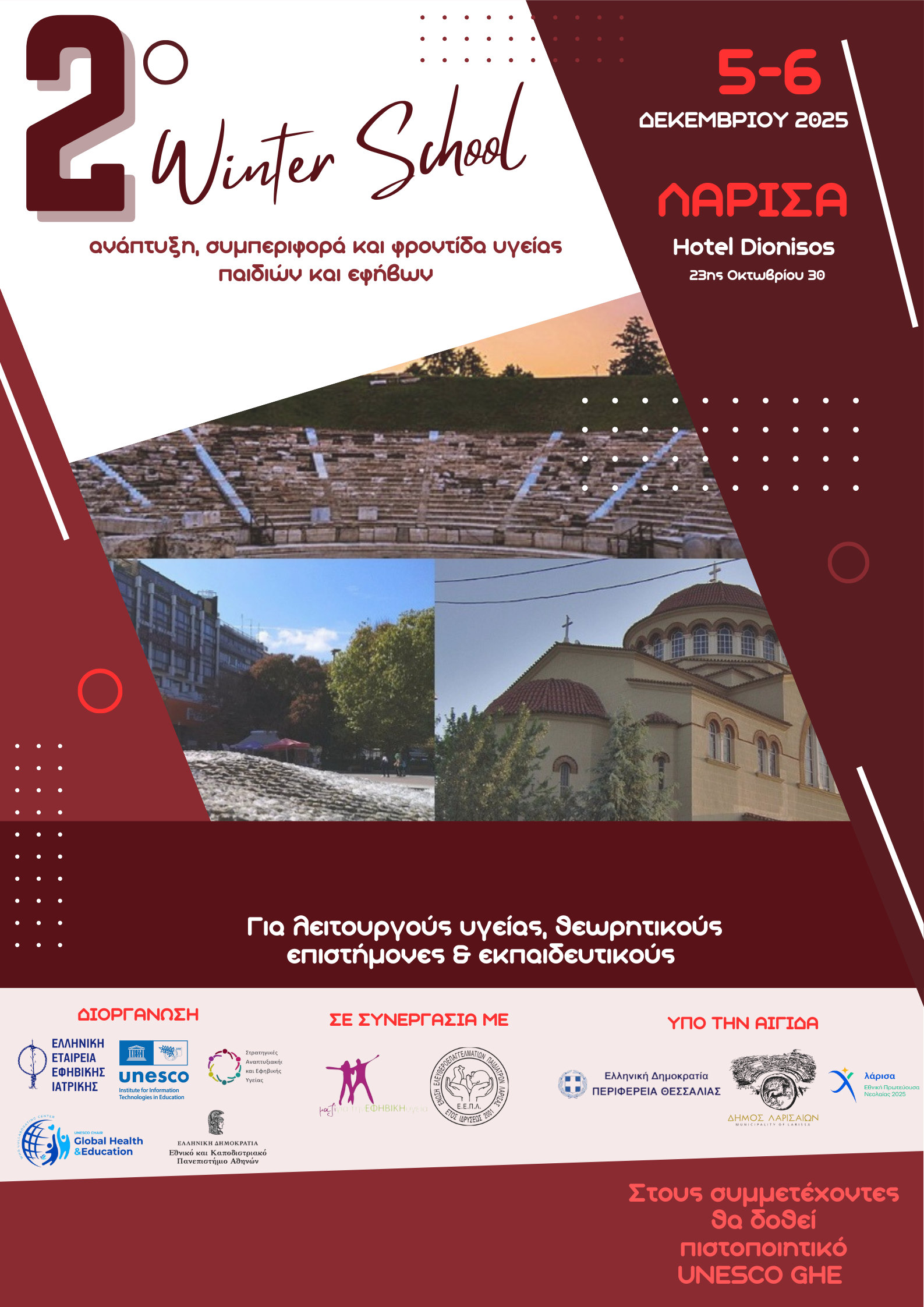 2ο WINTER SCHOOL Ε.Ε.Ε.Ι. "Ανάπτυξη, συμπεριφορά και φροντίδα υγείας παιδιών και εφήβων" 5-6 Δεκεμβρίου 2025 - Ξενοδοχείο "Διόνυσος", ΛΑΡΙΣΑ